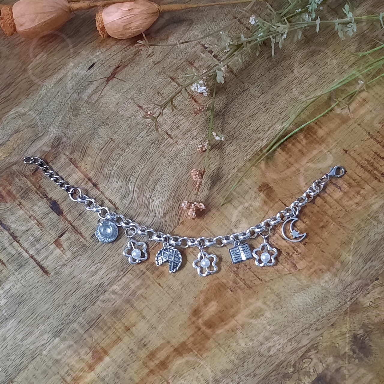 A unique charm bracelet. Made with sturdy rolo chain and a link clasp. This bracelet is a great way to show off your personal style. It’s the perfect gift for someone special, or a treasure for yourself. You’ll turn heads!
