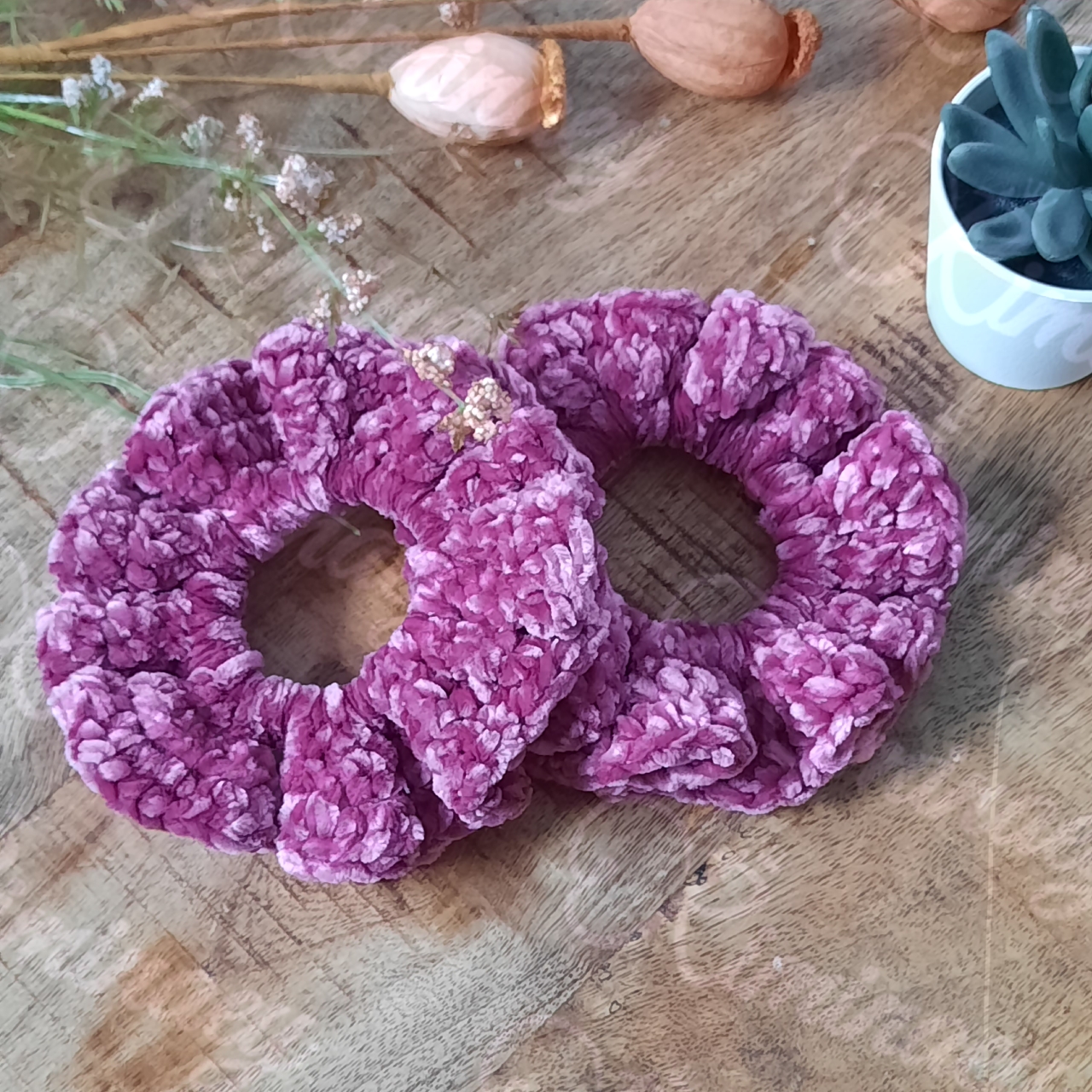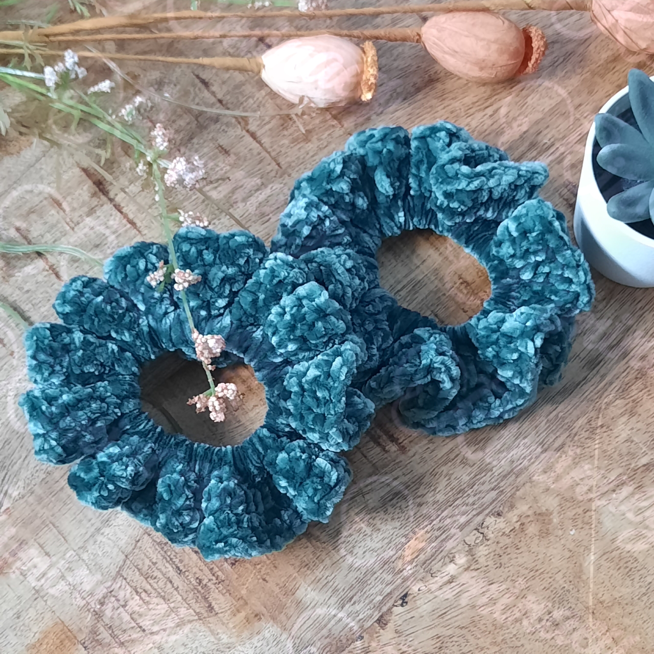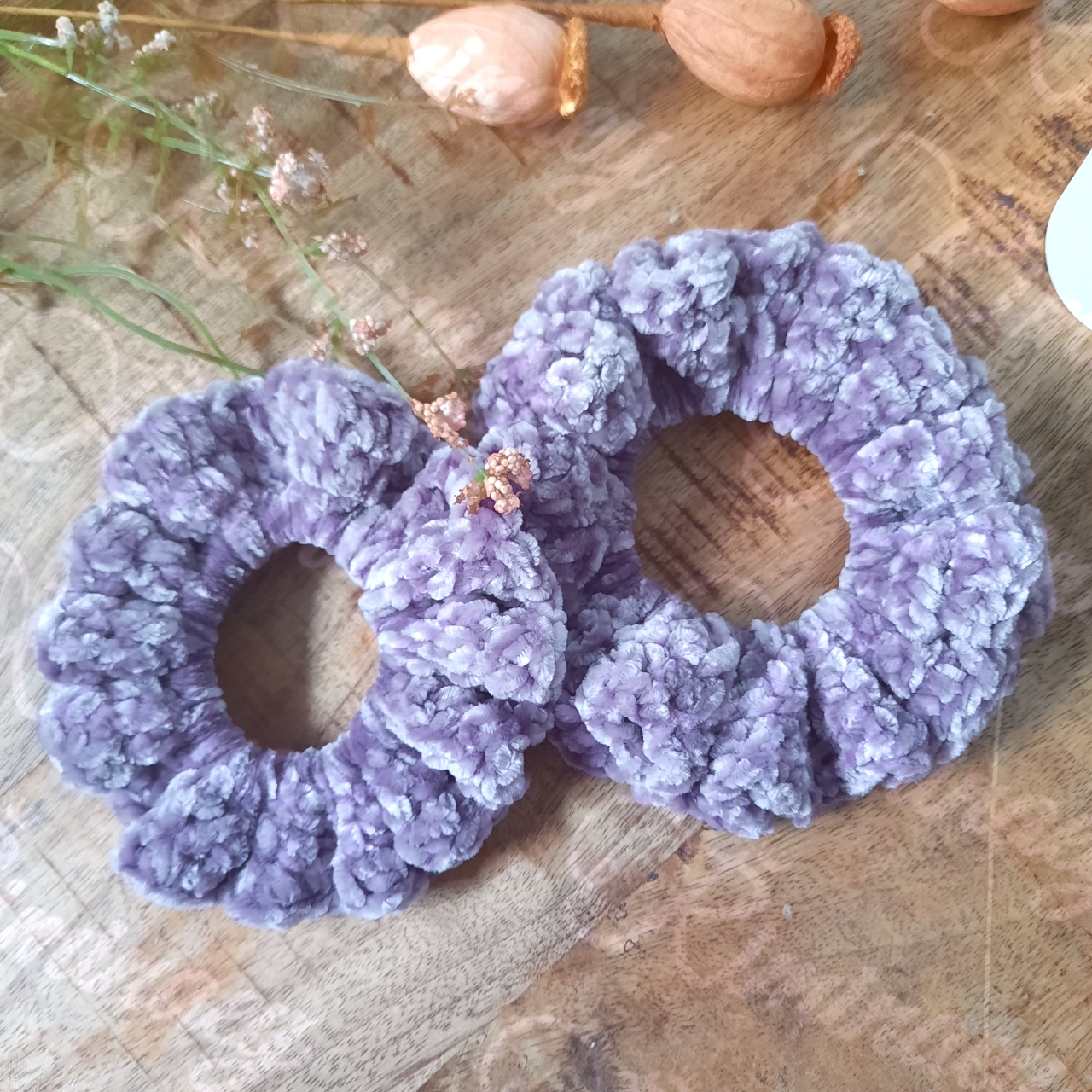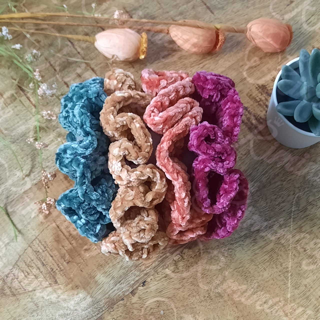Handmade crocheted velvet scrunchies available in various vibrant colors. Comfortable to wear in your hair or on your wrist. The scrunchie is made of plush velvet yarn and a strong elastic core, both soft and stretchy.